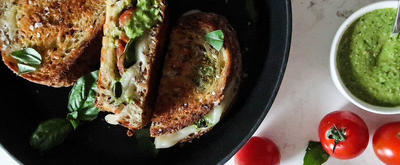 On a work surface, lay out 4 slices of bread. Spread 1 tablespoon of arugula pesto on 2 of the slices. Top with tomato slices and basil, followed by cheese in an even layer. Top with remaining bread slice to make a sandwich.