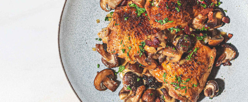 Remove chicken from pan and place on a serving platter. Add in heavy cream and mushrooms and simmer until sauce is thickened and coats the back of the spoon. Taste and season with salt and pepper as needed. Spoon sauce over chicken and garnish with bacon and chopped herbs.