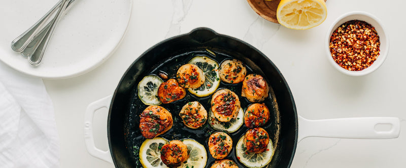 Heat olive oil in a cast iron skillet over medium heat. Once oil is sizzling, add the scallops and sear on both sides until browned - about 2-3 minutes each side. Remove scallops from the skillet and set aside.