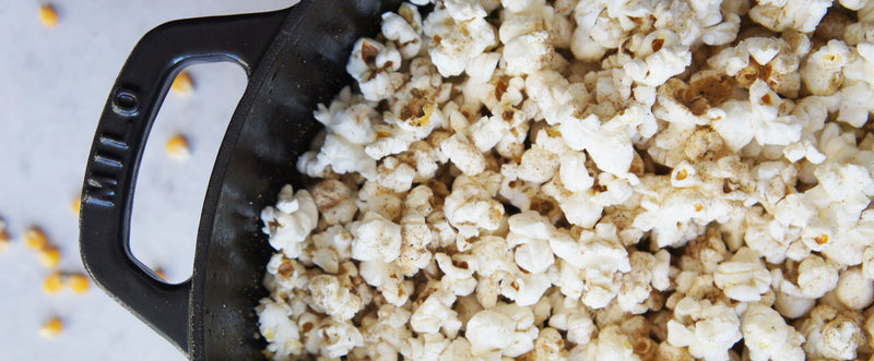 Put 2 tablespoons of vegetable or coconut oil in a cast iron Dutch oven on a medium-high heat. After 1 minute throw in three popcorn kernels and cover the pot with the lid. Listen carefully for a couple minutes and when you hear those three kernels pop you know the oil is ready! Carefully lift the lid and pour in the remaining ½ cup of popcorn kernels. Replace the lid and using oven mitts, grab the handles of the Dutch oven and gently shake.