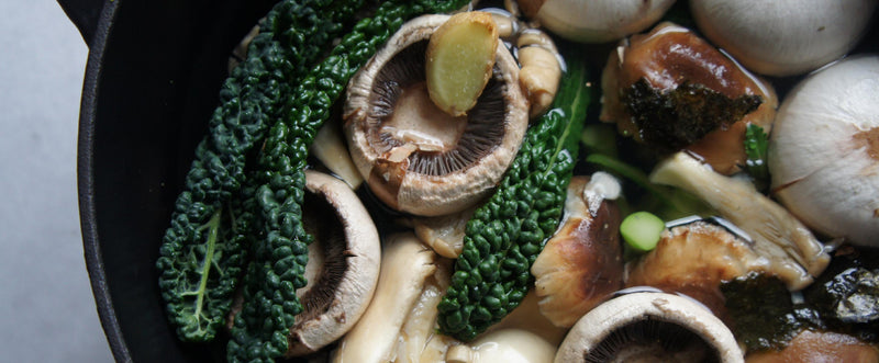 Place all of the whole mushrooms, chopped veggies, torn seaweed and ginger into your Kana Dutch oven and drizzle with sesame oil. Heat up the pot and sautée the veggies for a few minutes and then cover with enough hot water to completely submerge your ingredients.