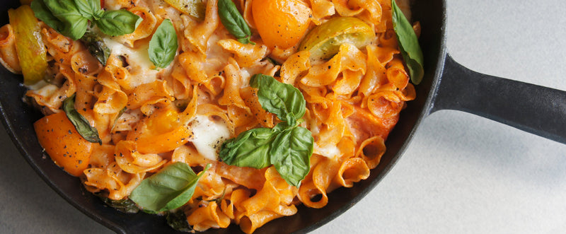 Once the pasta, sauce, tomatoes, cheese and herbs are all combined, transfer the pasta into your Kana skillet. You can set this aside to cook later, or cook right away. Preheat your oven to 375ºF and cook for 10-15 minutes or until the cheese is bubbly and the tops of the pasta shapes are starting to look a bit golden.