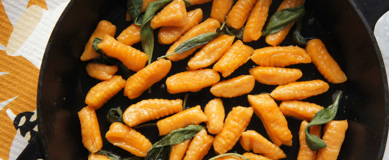 Heat up a pot with boiling water and cook the gnocchi for no more than 3 minutes, drain and set aside. Heat up the butter in a cast iron skillet and gently pan fry the gnocchi till slightly crispy on each side.