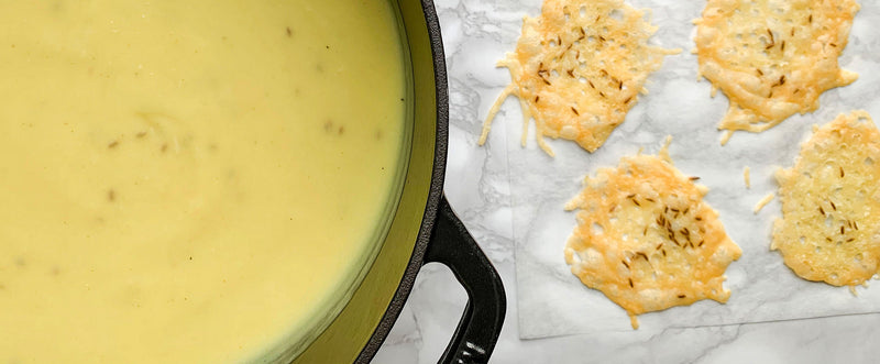 Meanwhile, preheat the oven to 400℉ (200℃) and line a baking sheet with Kana parchment paper. Using half of your grated cheese, drop small handfuls of the cheese on to the paper so that you have small, flat piles. Place the sheet into the oven and cook for about 5- to 7 minutes, keeping a close eye on the cheese. Once the cheese is fully melted, bubbling and crispy, remove from the oven and set aside.