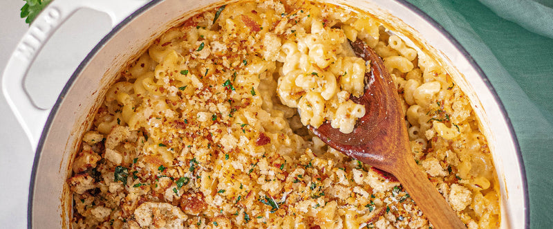 Heat a large Dutch oven over medium heat and melt the remaining butter. Add flour and stir until smooth and golden brown. Cook for about 1 minute as mixture starts to bubble and thicken. Slowly pour in milk, whisking to combine. Bring to a boil and then lower heat to a simmer until sauce is thickened, about 6-8 minutes. Add half the shredded cheeses, whisking until melted and combined. Add mustard, cayenne, salt and black pepper. Remove from the heat, add pasta and stir in the remaining cheese and top with bread crumbs.