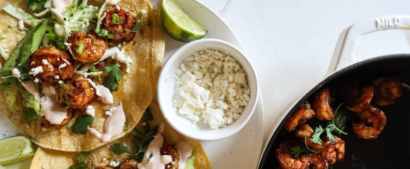 Serve warm tortillas with honey chipotle shrimp and jalapeno slaw. Top with green onions, avocado, sour cream, cilantro, pickled onions and hot sauce if desired. Enjoy right away.