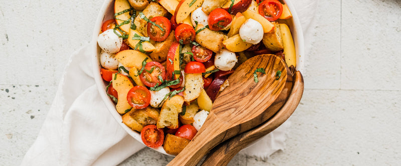 In a large bowl, add peaches, cherry tomatoes, bocconcini, croutons and basil. Drizzle half of the dressing and toss till well combined. Allow salad to sit for about 20 minutes, till it absorbs some of the dressing. Add more dressing if desired, toss again and serve.