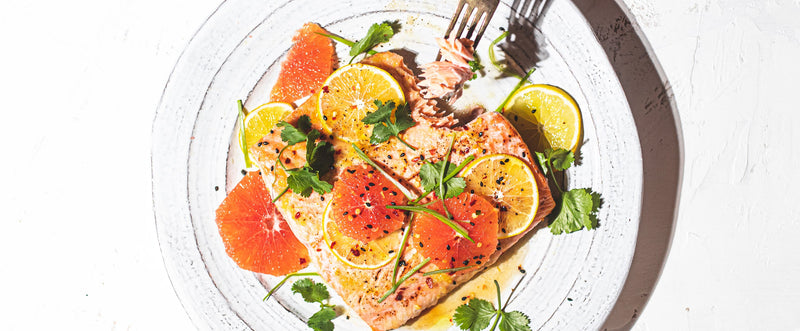 Add salmon to a serving platter or large plate. Pour any left over juice in the sheet tray over salmon. Top with orange and Meyer lemon slices. Sprinkle with black sesame seeds and chili flakes. Garnish with cilantro leaves, scallions and flaky salt.