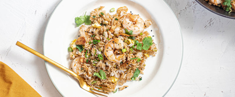 Stir in shrimp, crispy garlic, cilantro and sesame oil. Remove from heat and garnish with sesame seeds and black pepper.