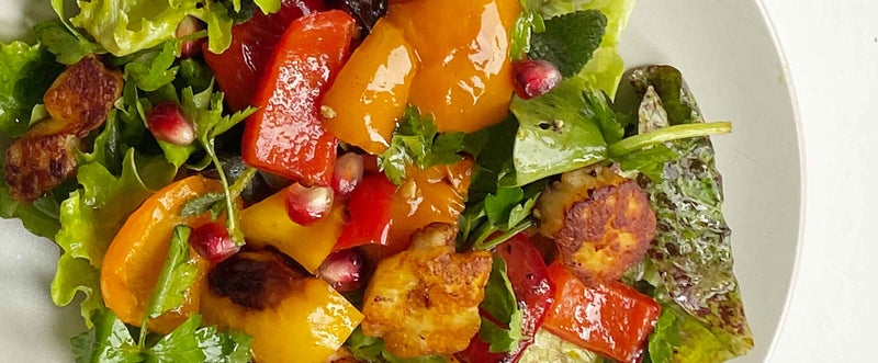 Allow the halloumi to cool alongside the peppers and toss the salad leaves and herbs in a large bowl with a squeeze of lemon juice and salt and pepper.