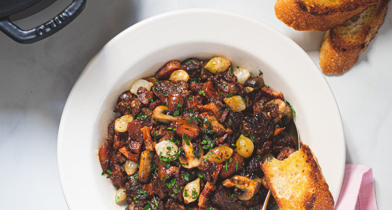 Remove Dutch oven from oven and stir in mushrooms, pearl onions and pancetta or bacon. Garnish with parsley and serve with a toasted baguette.