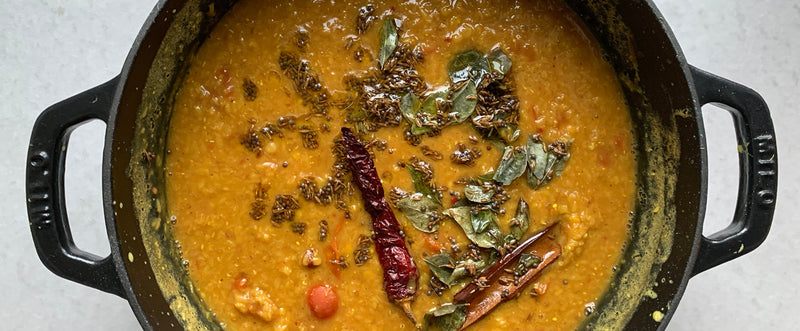 While the soup is simmering, heat up the ghee or butter in your Kana Ultimate Skillet and throw in the cumin and mustard seeds and the curry leaves, cinnamon and chillies. After a few seconds the seeds should begin to sputter and pop; remove from heat and set aside.